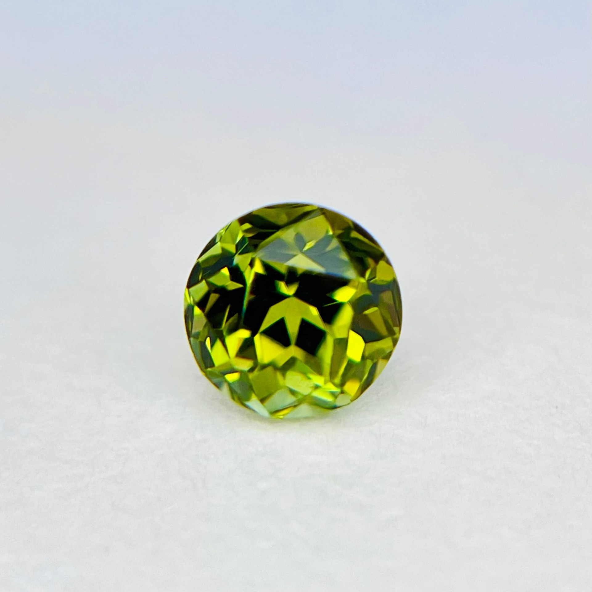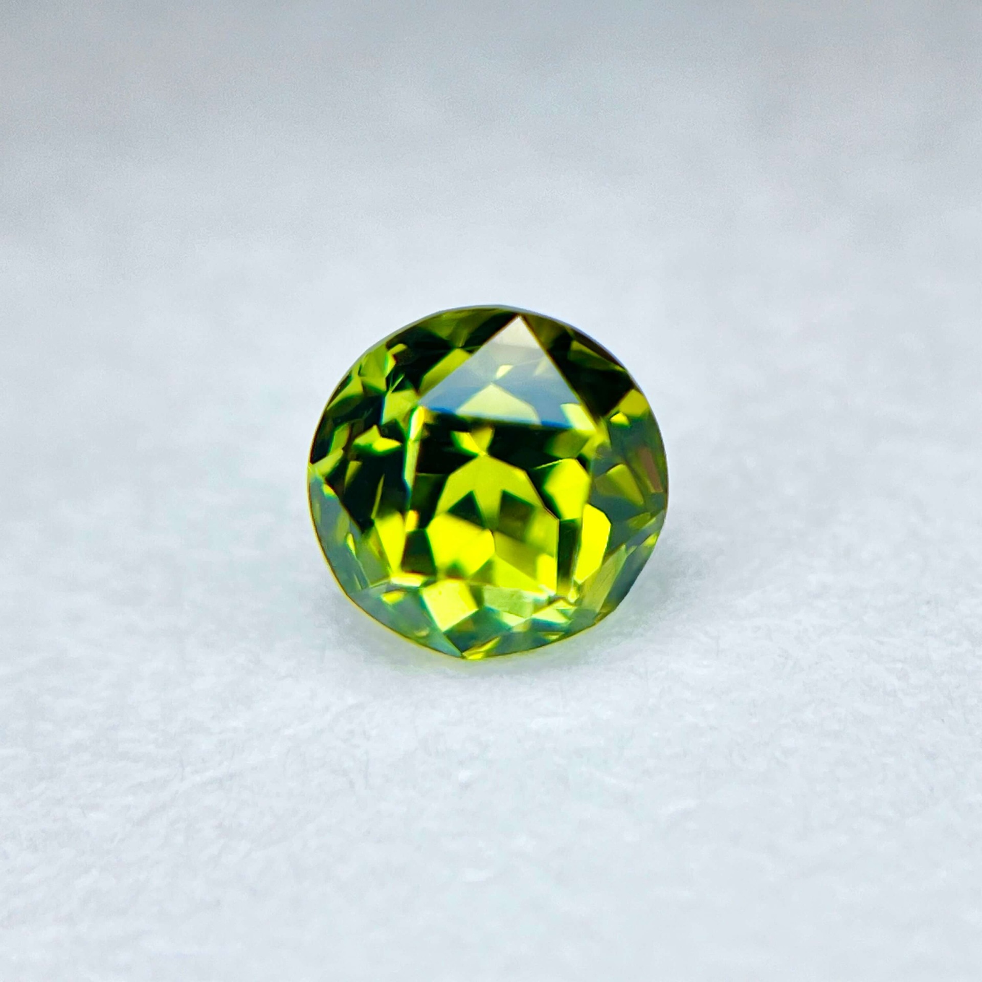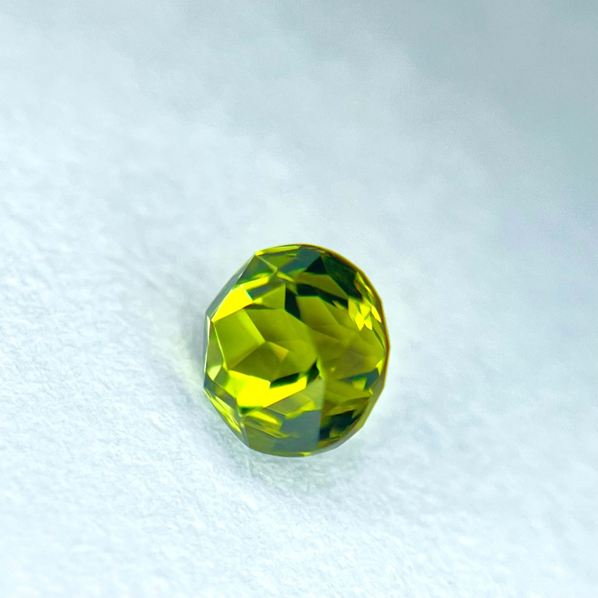 10. 評|來自美國加州著名的喜瑪拉亞礦脈,此枚黃綠色碧璽色澤飽滿而柔和,切割後的圓形外觀與我們引以自豪的美國亞利桑那阿帕契橄欖石系列的圓形火彩橄欖石極為相似,卻擁有更高的硬度與耐久性。無燒無處理、通透乾淨的晶質加上完美車工,使其成為兼具美感與CP值甚高的精品碧璽。