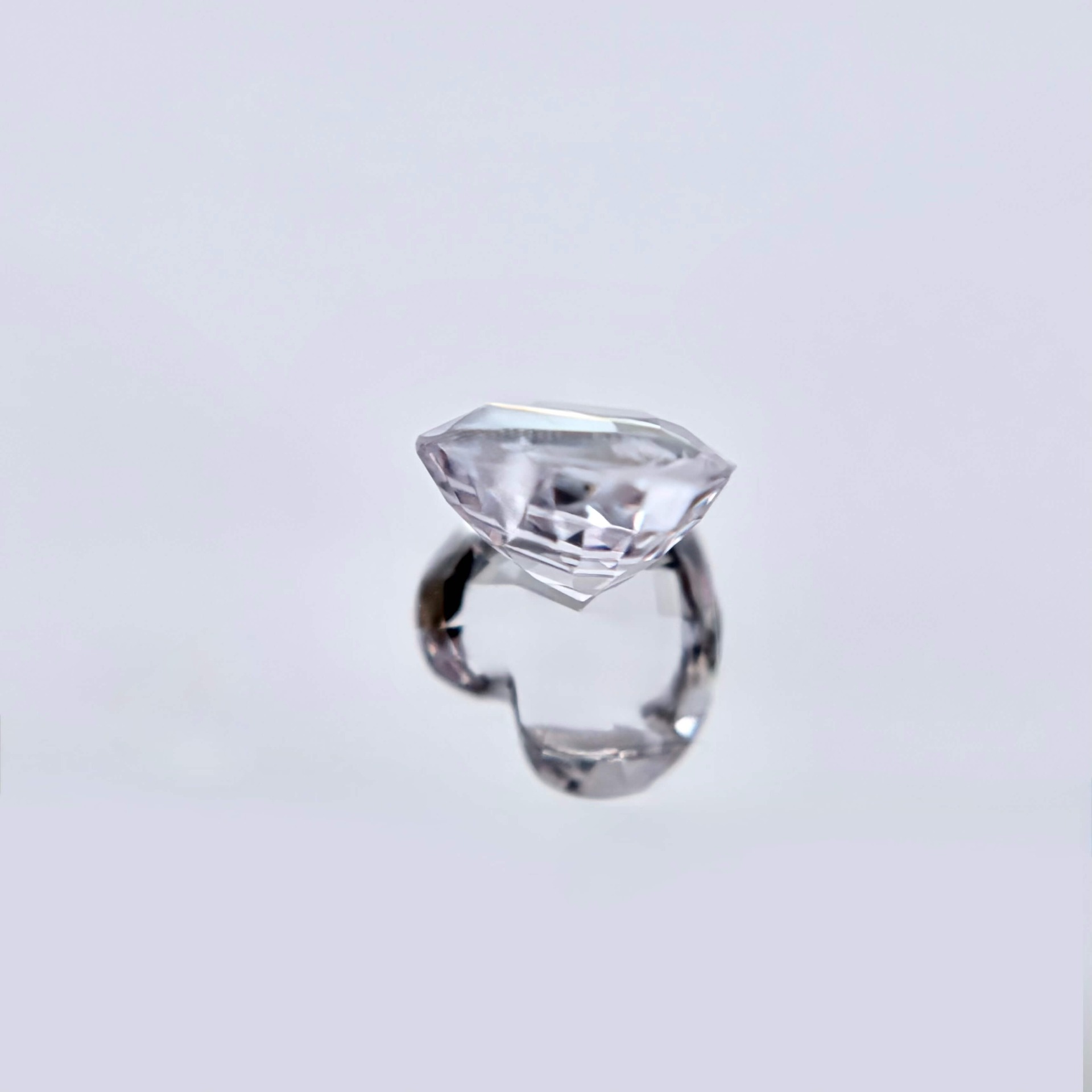 尖晶石以其高折射率與穩定光學性質著稱,在無色至近無色的範疇中,若帶有些許冷調藍感,往往能呈現出更為清冽、純淨的視覺印象。本件作品即屬此類型,整體基底無色透明,於光線下隱約帶出一絲冷藍光感,使寶石在簡潔之中保有細膩層次。