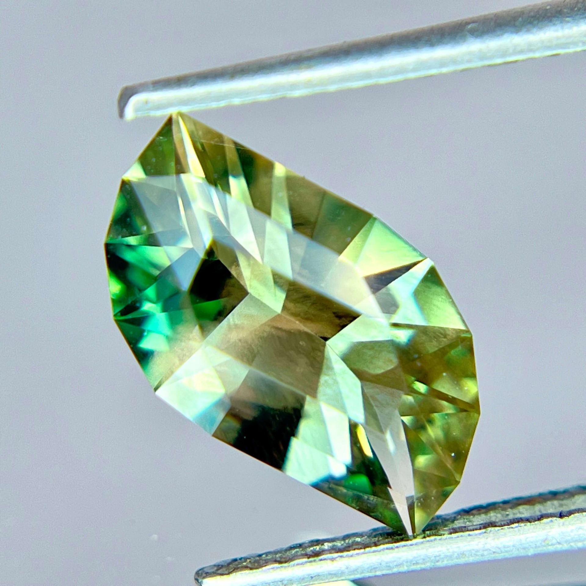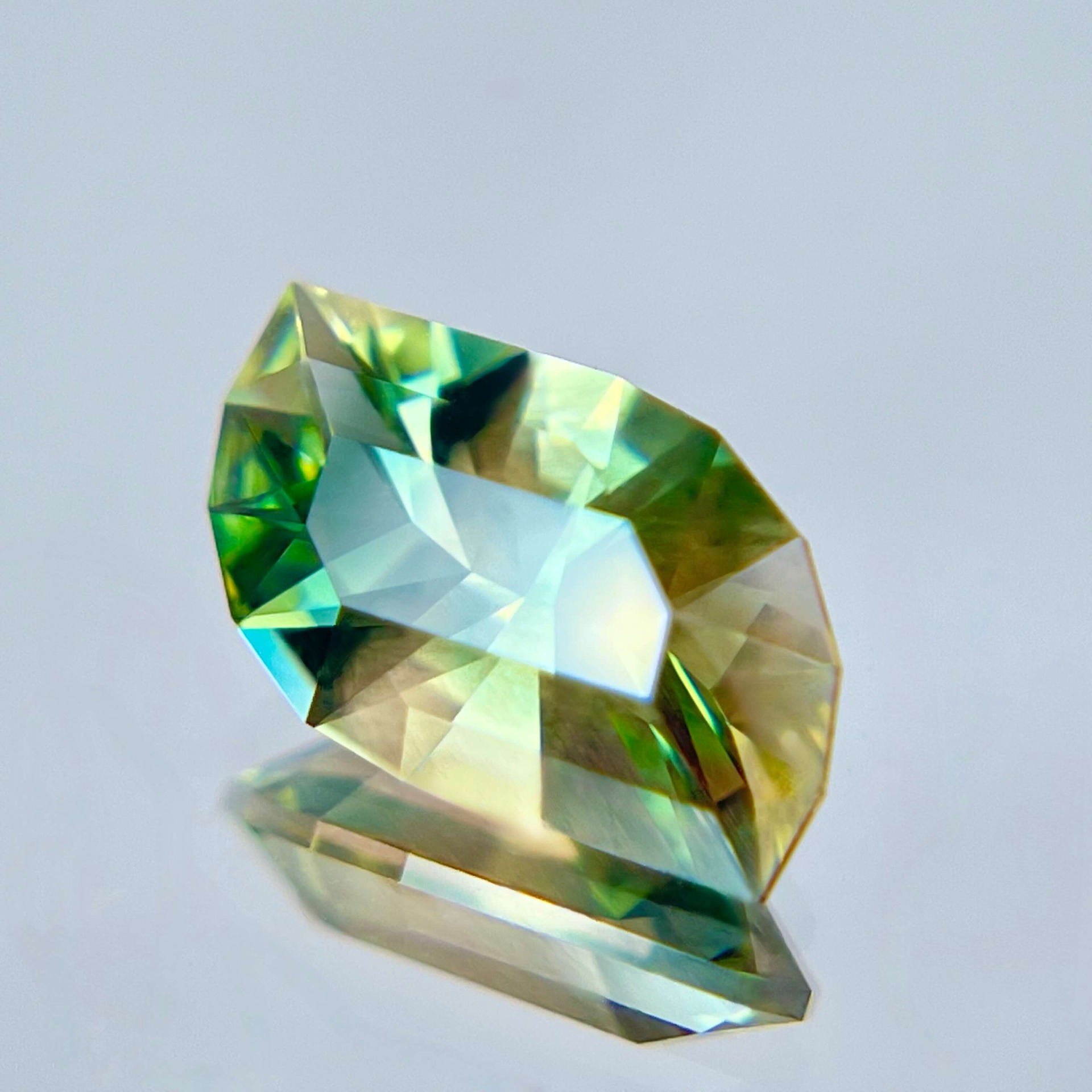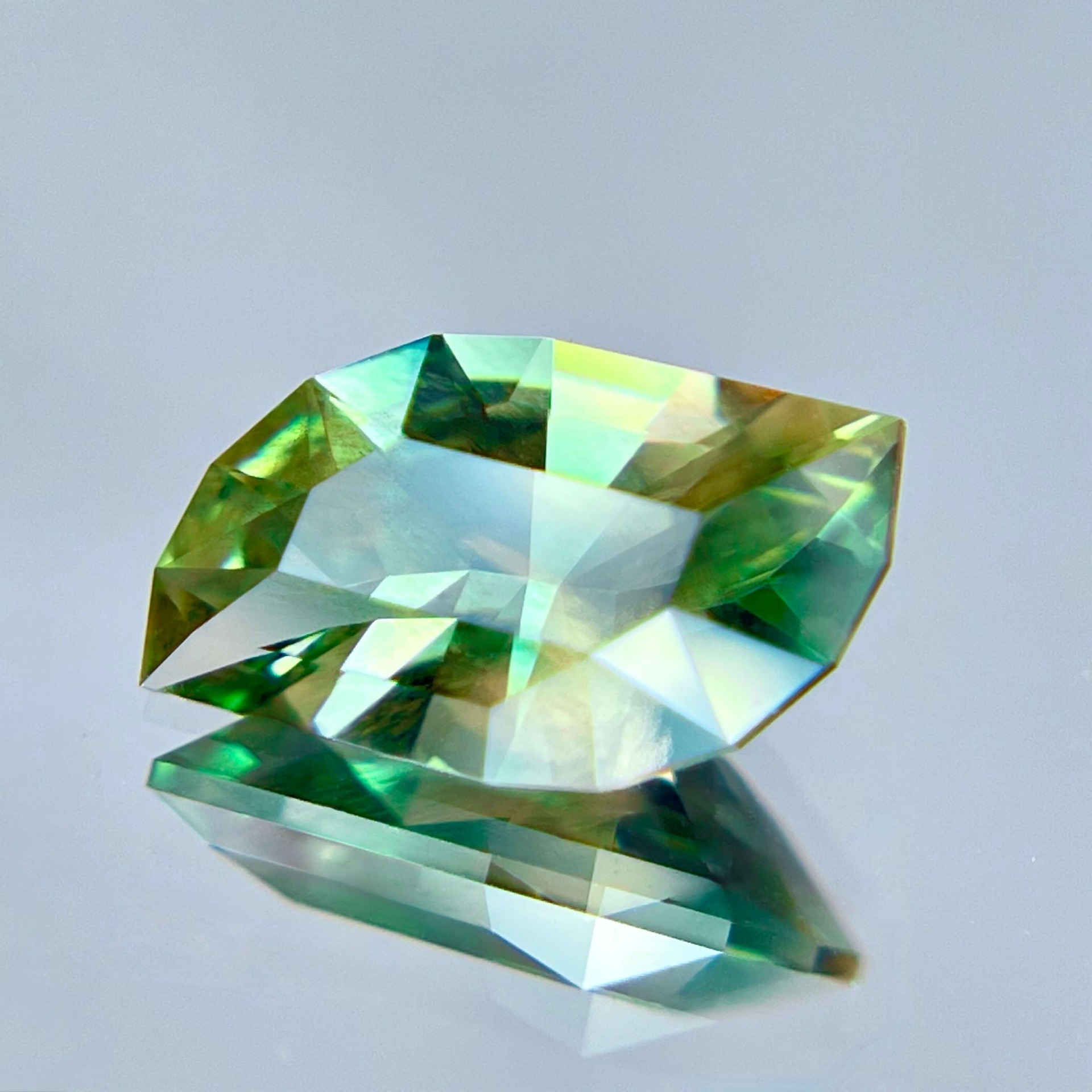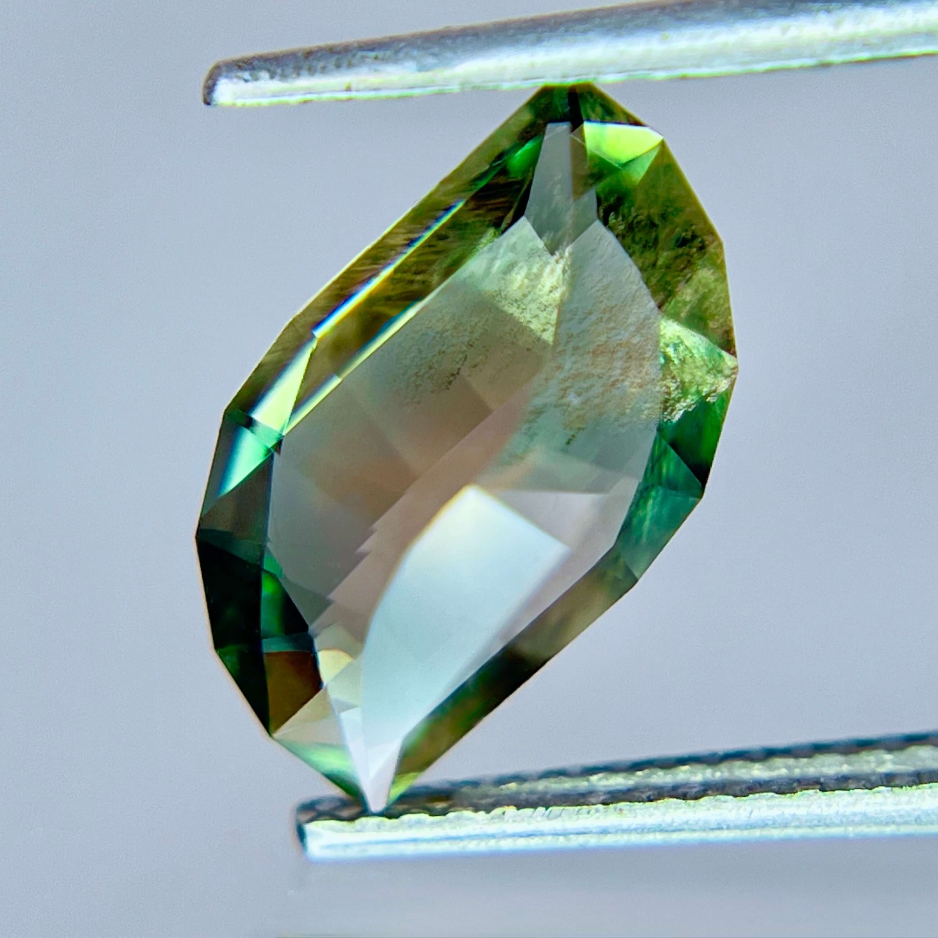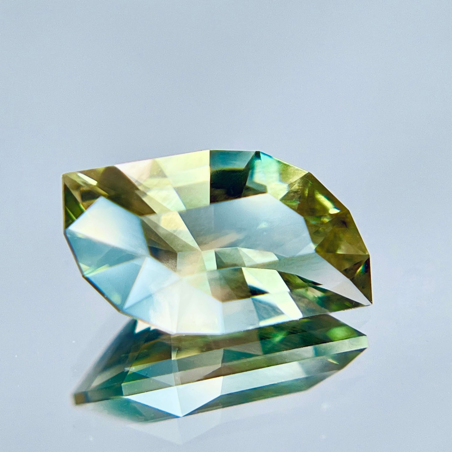 本枚寶石更難得之處,在於其罕見的 藍綠雙色光感(Blue-Green Dichroic)。一般奧勒岡太陽石多以橙色、香檳色或綠色調為主,而帶有藍色色階的晶體在自然界中極為稀少。當藍綠色基底與銅元素所產生的紅銅色 Schiller 互相交織時,寶石在不同角度下會同時呈現藍、綠與淡粉銅色的層次變化,使整體色彩顯得格外豐富而立體。如此多彩而協調的色域組合,在奧勒岡太陽石中並不常見,也因此格外受到收藏市場的青睞。