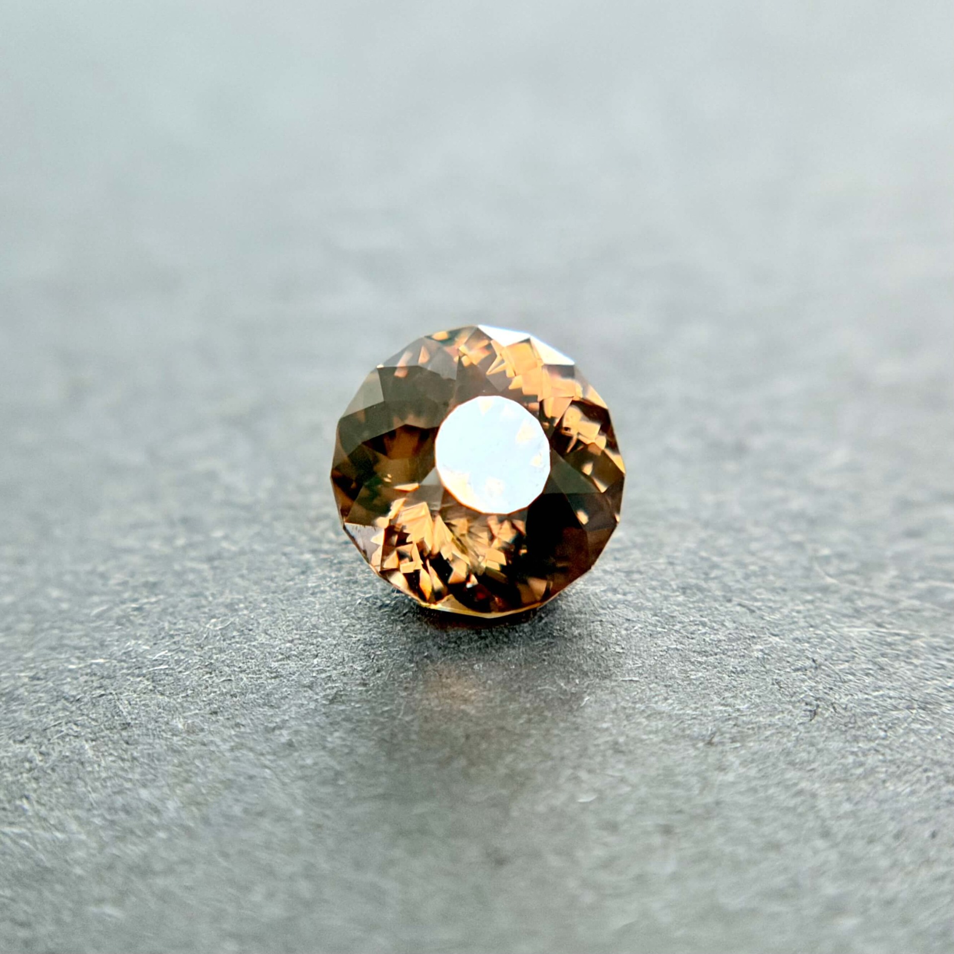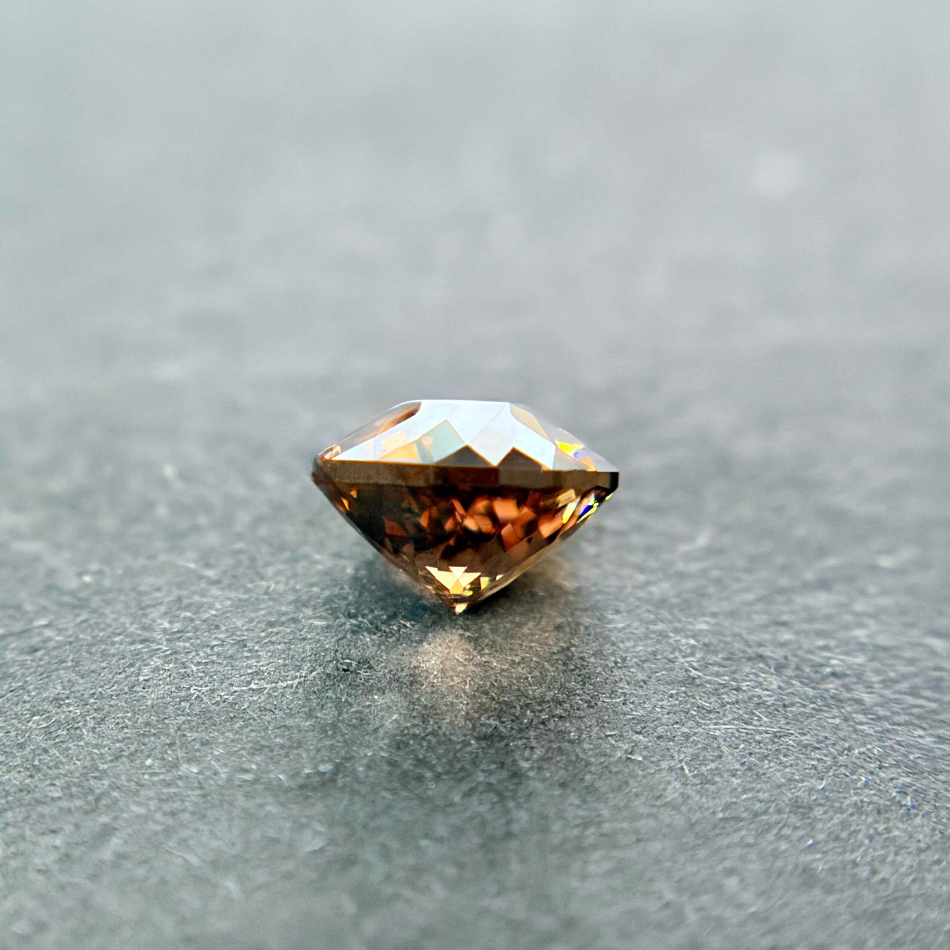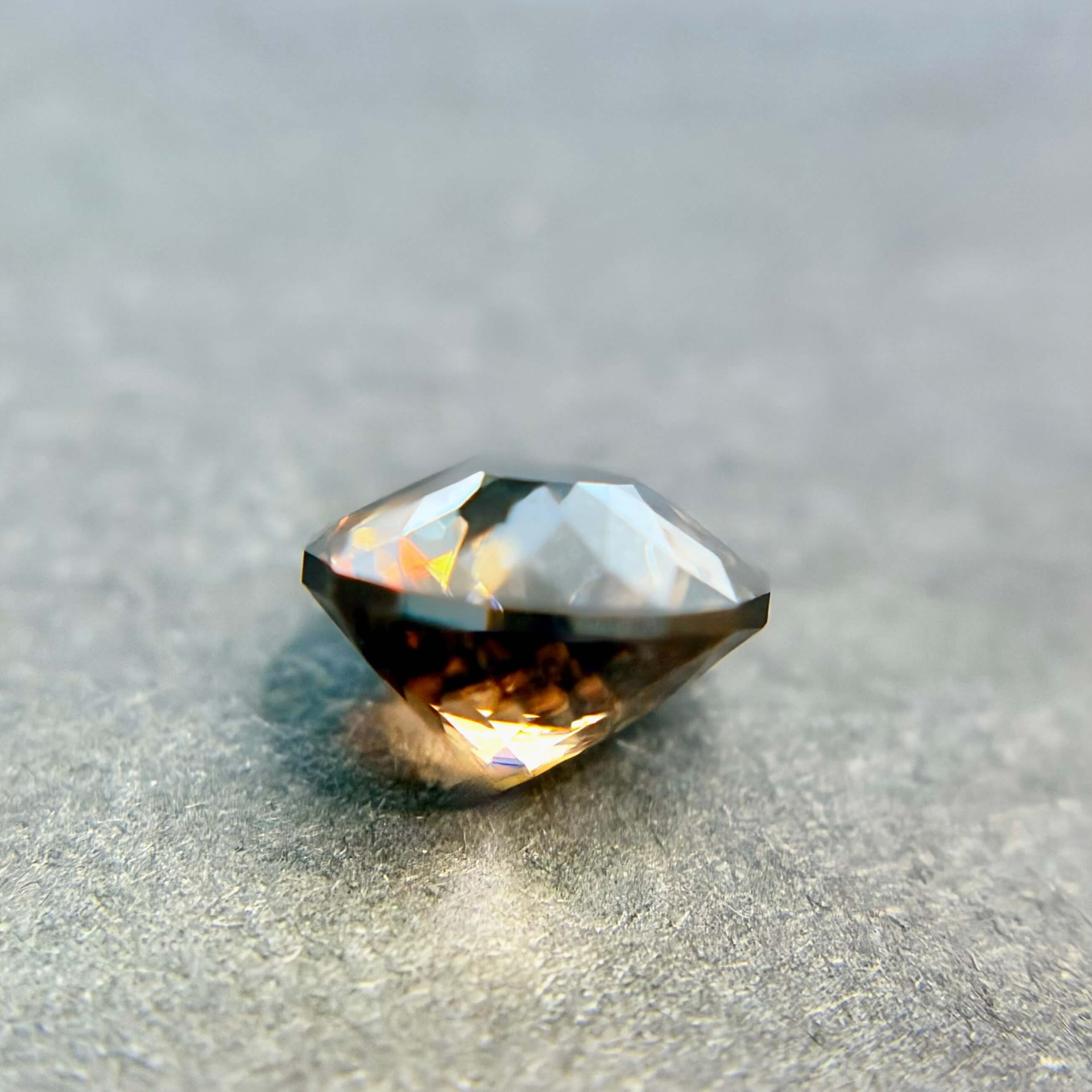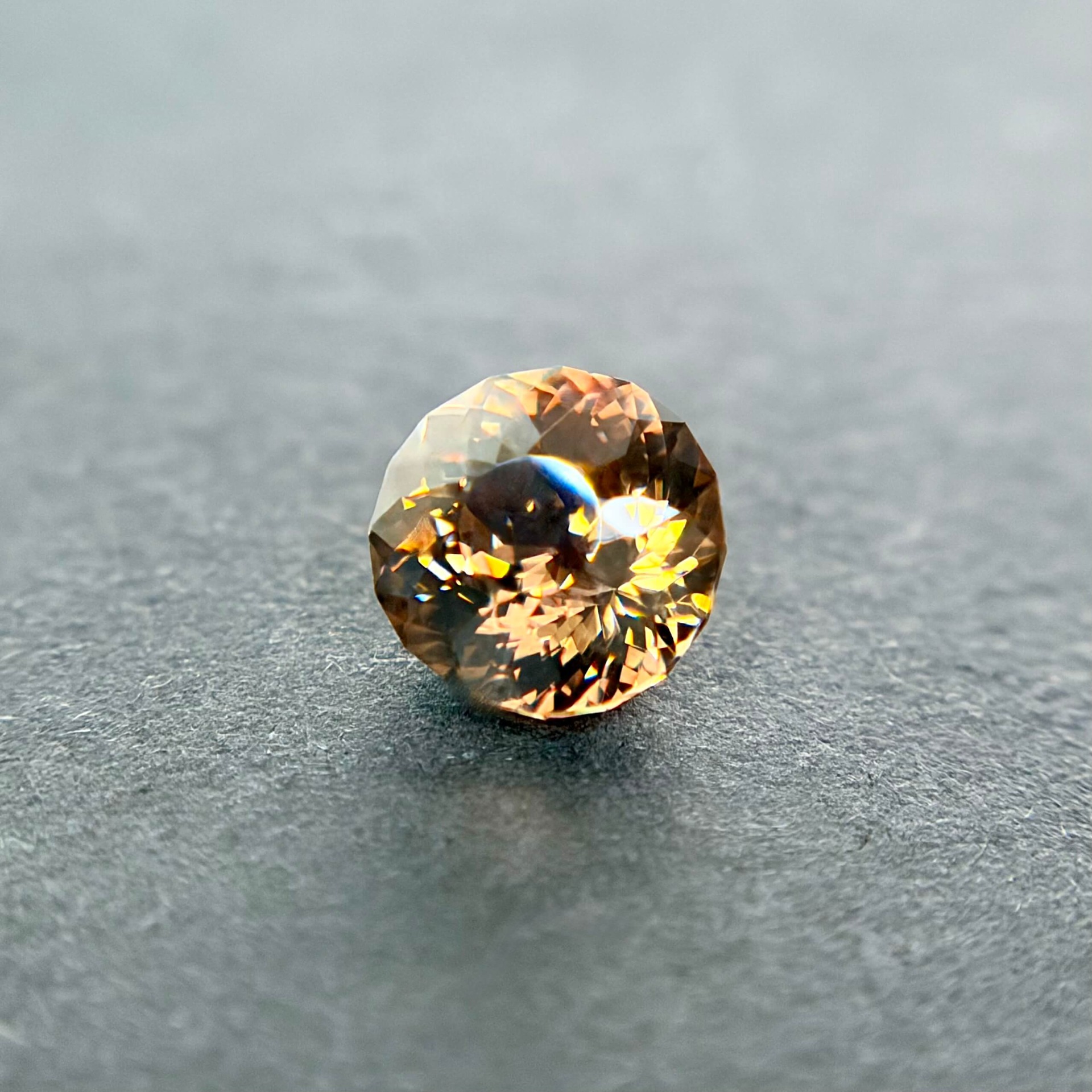 鋯石為天然高折射率寶石,其火彩與亮度常被譽為「天然寶石中最接近鑽石者」,在光線下可展現強烈色散效果。相較市場常見的藍色熱處理鋯石,此顆來自奈及利亞之褐香檳色鋯石為純天然無燒狀態,色澤溫潤而帶金褐光感,兼具成熟與優雅氣質,屬較少見之自然色系。其淨度達 FL 等級,使火彩表現不受包裹體干擾,整體光感乾淨銳利。鋯石亦為古老寶石之一,地質年齡可追溯至數十億年前,具有獨特的收藏意義。此顆搭配設計師款圓形切工,使火彩集中、亮度提升,兼顧佩戴實用性與鑑賞價值,為少見兼具天然性、完美淨度與高火彩表現的收藏型鋯石。