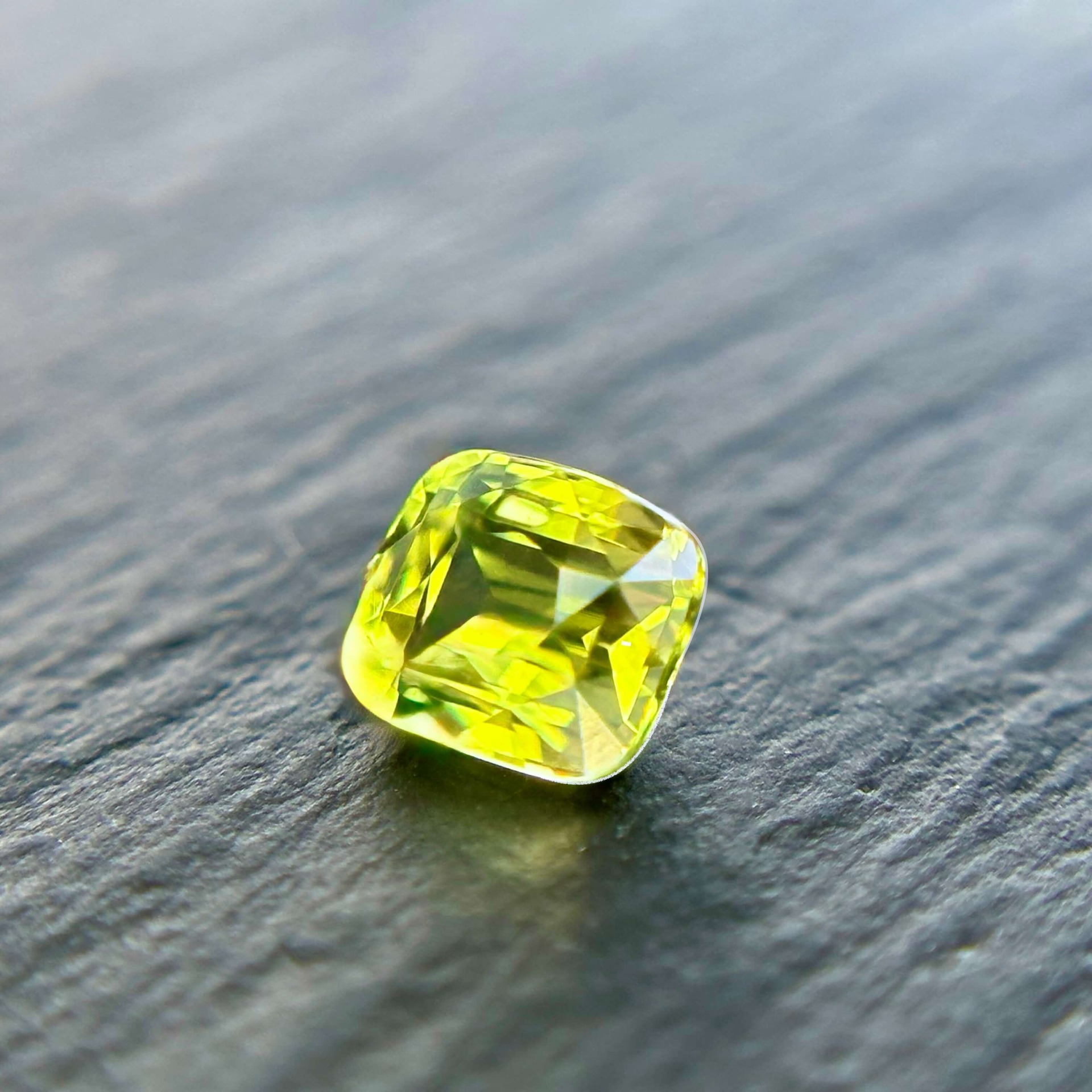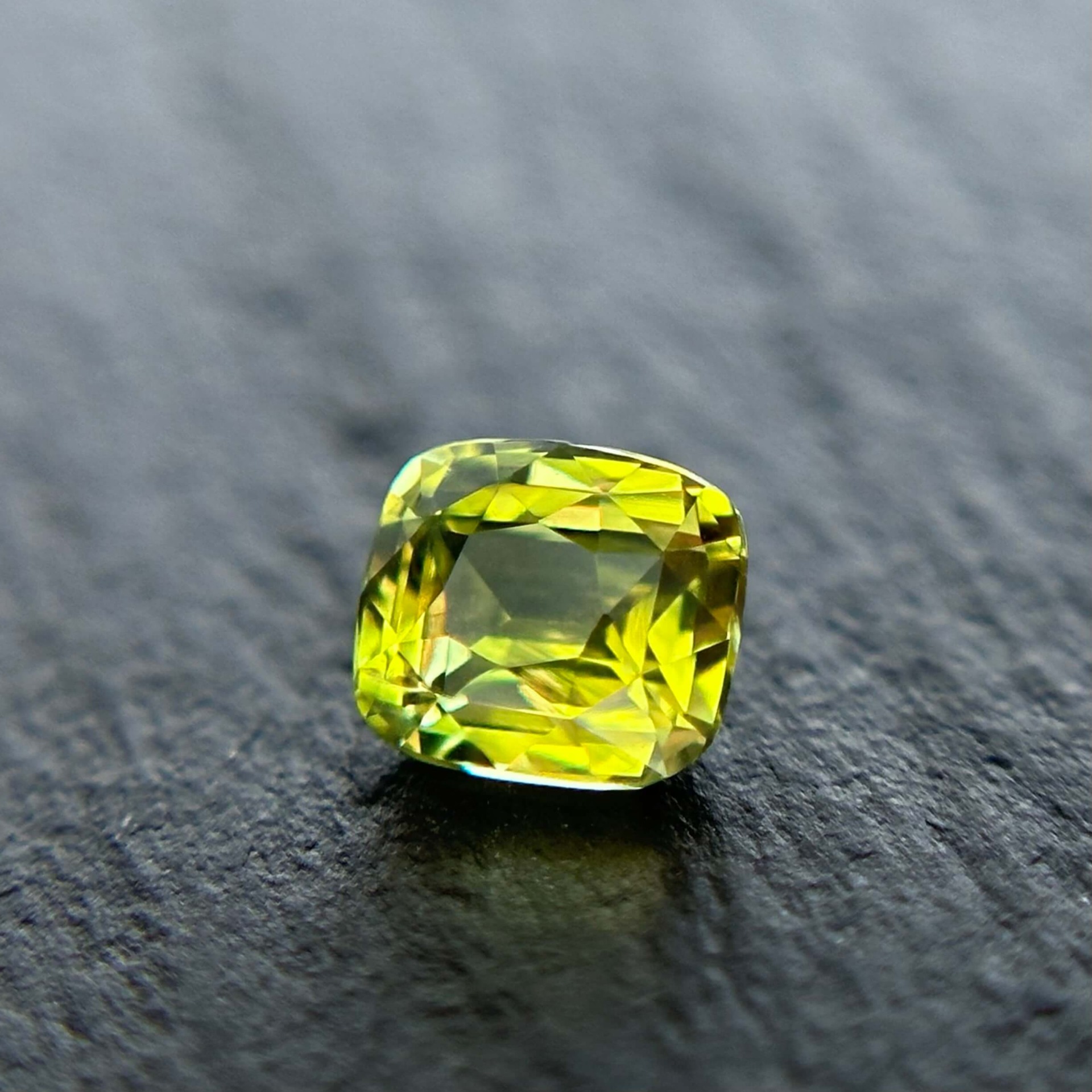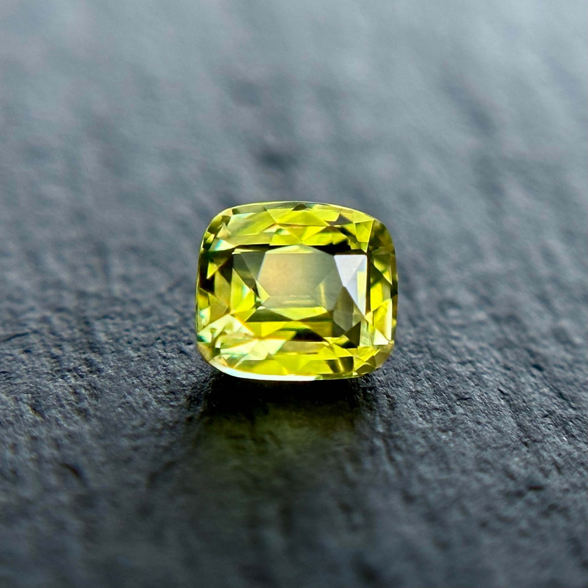 其色澤呈現帶有輕微綠調的黃色,視覺上讓人聯想到春季田野間盛開的油菜花田——那種大片金黃之中帶著自然生機的柔和色彩。搭配枕形明亮車工,寶石在保留古典比例的同時,也呈現出均衡而柔亮的光感。