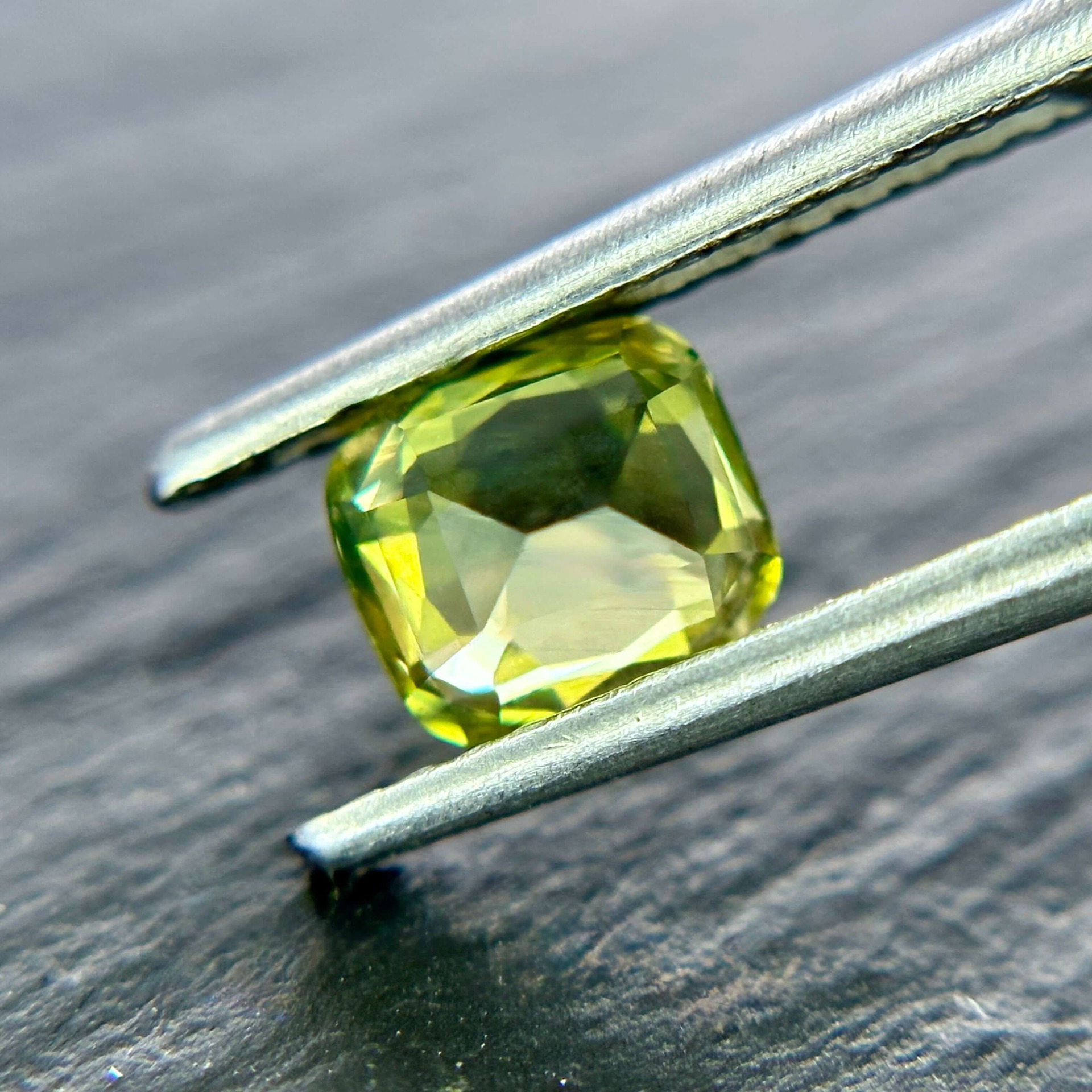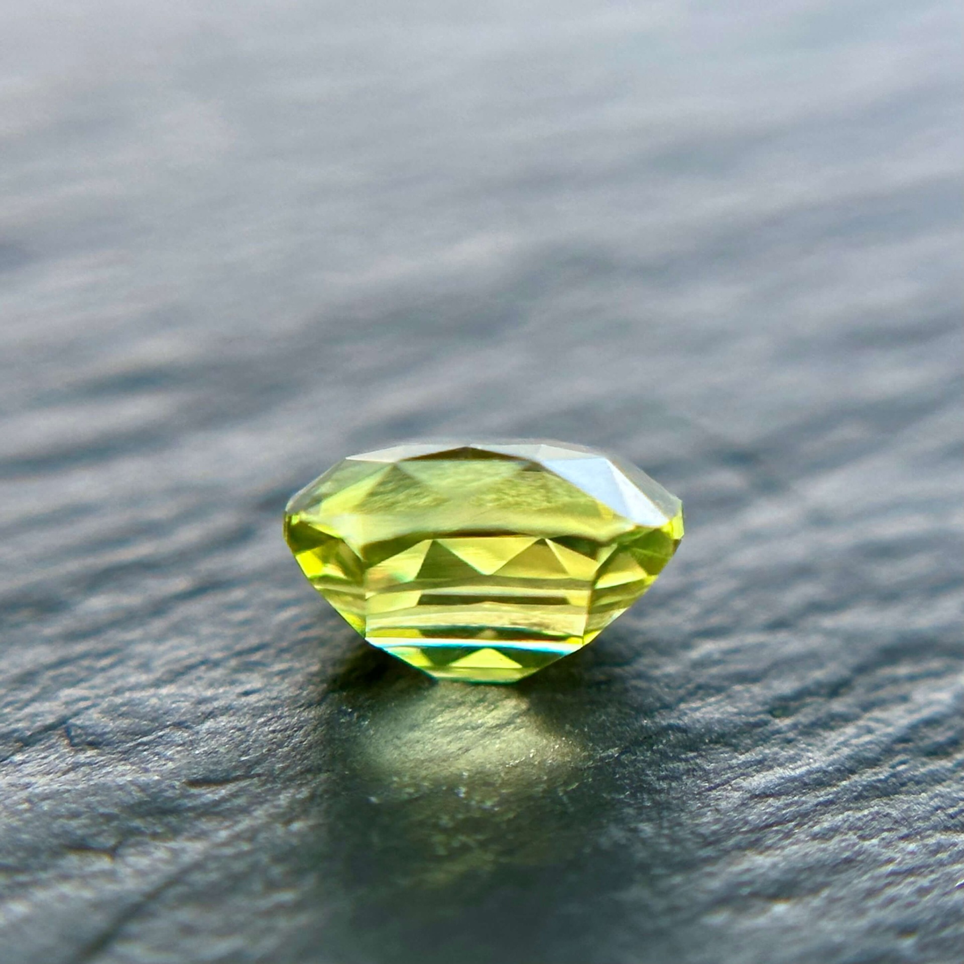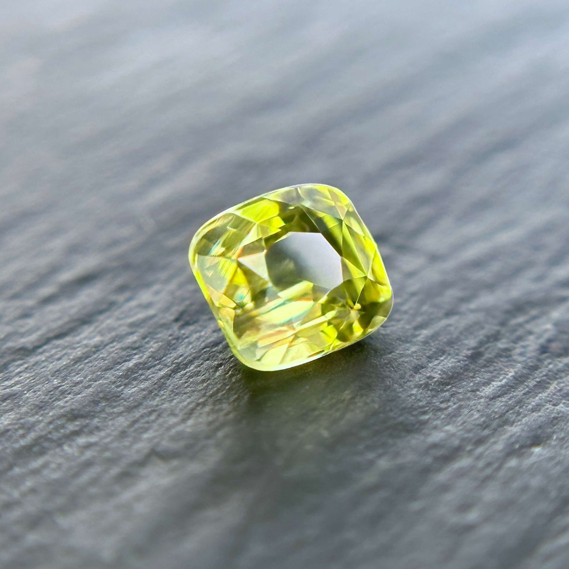 其色澤呈現帶有輕微綠調的黃色,視覺上讓人聯想到春季田野間盛開的油菜花田——那種大片金黃之中帶著自然生機的柔和色彩。搭配枕形明亮車工,寶石在保留古典比例的同時,也呈現出均衡而柔亮的光感。